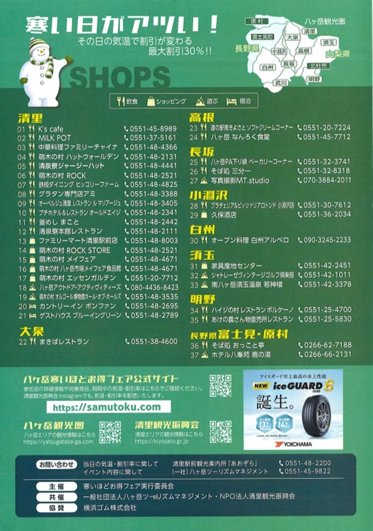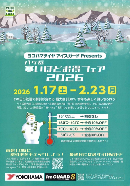 その日の朝10時の気温で参加店舗の対象商品が”寒いほど”割引になる寒い八ヶ岳ならではのイベント
