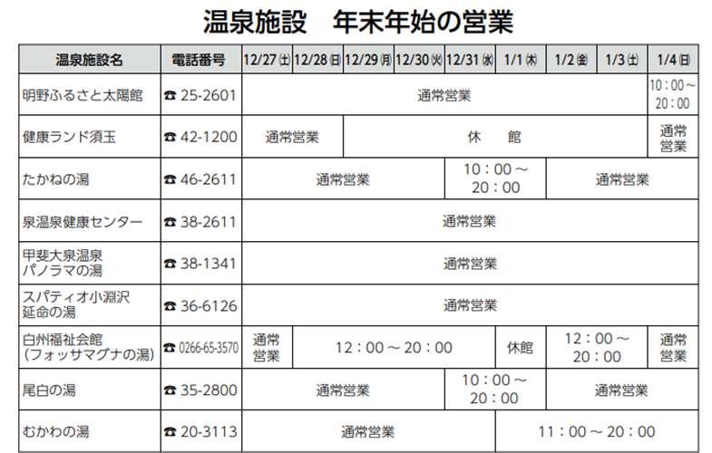 北杜市内の気軽に立ち寄れる日帰り温泉、身体の芯からあたためられる温泉は心までぽかぽかに。年末年始の営業をお知らせします。 市外局番は0551-です。 ※諸事情により変更がある場合がありますので、ご利用の際はご確認ください。